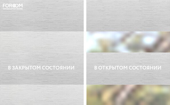 Полотно ткани, состоит из чередующихся горизонтальных полос – прозрачных и непрозрачных. Изменяя положение этих полос относительно друг другу, можно создать целых 3 режима регулировки светом. Например, чтобы в помещении стало светлее, нужно расположить прозрачные полосы друг напротив друга. Если разместить прозрачную и непрозрачную полосу параллельно друг другу, то можно добиться практически полного затемнения.